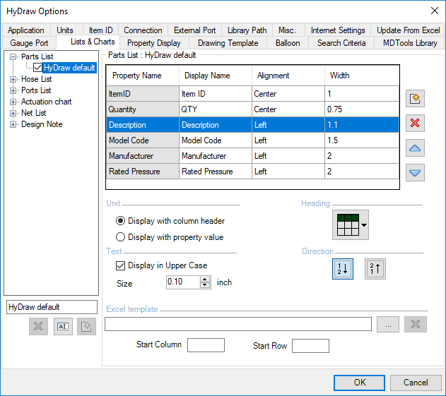 1. Click the Lists & Charts tab of HyDraw® options to select Parts list.
