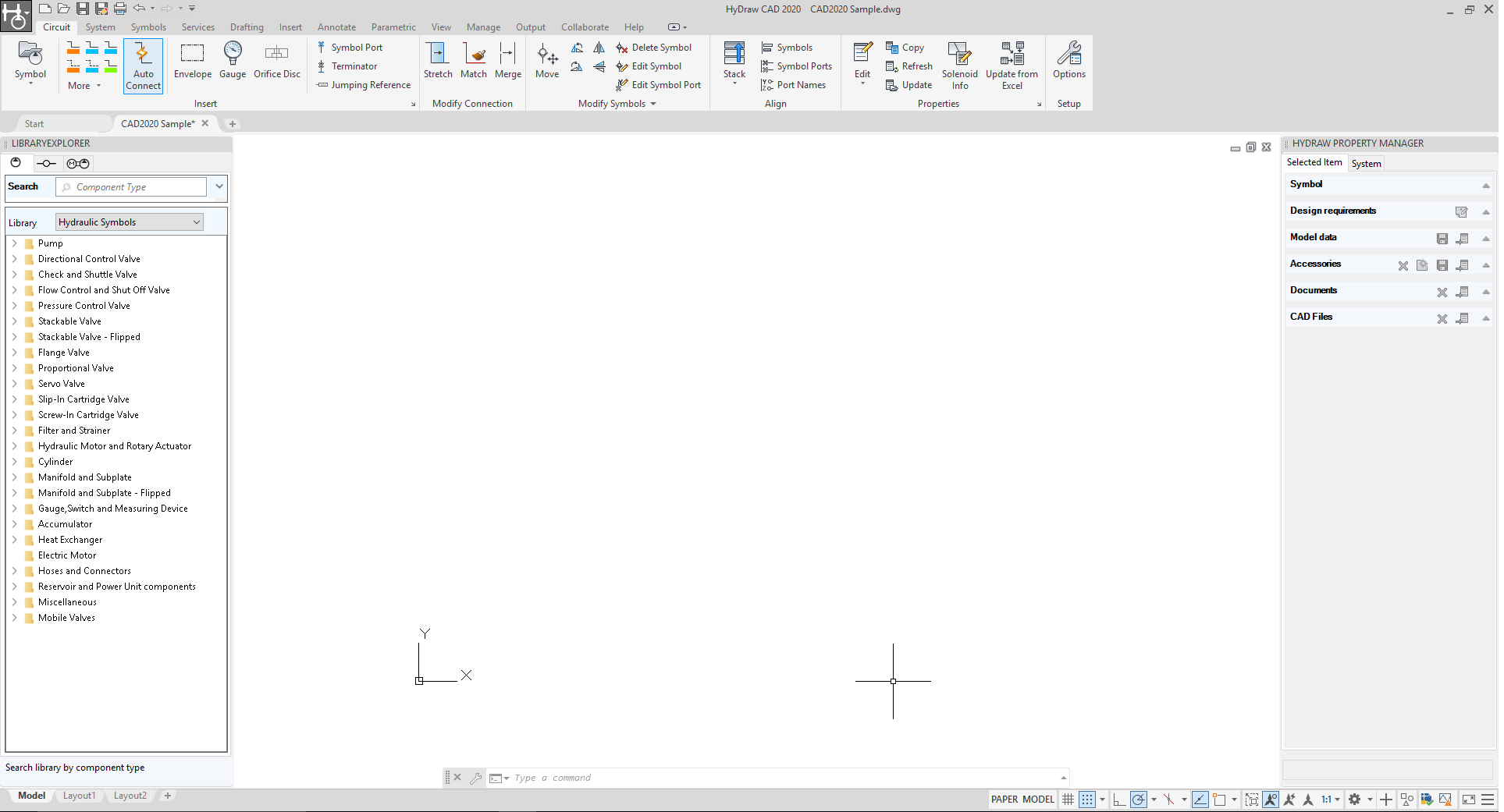 HyDraw CAD opens with the Ribbon menu, Library Explorer and Property Manager.