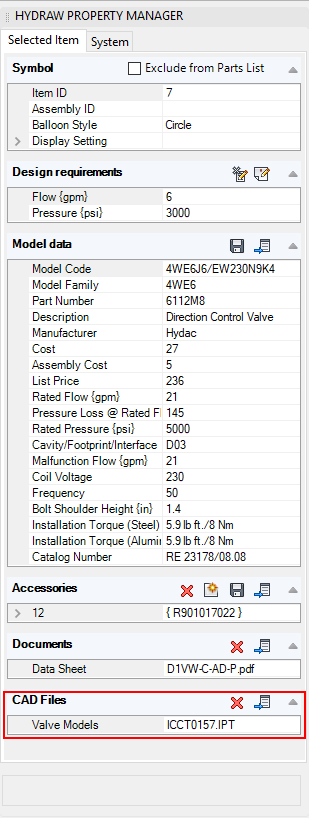 The CAD Files section displays the CAD files linked with the selected component model. Delete and link CAD files from the library.