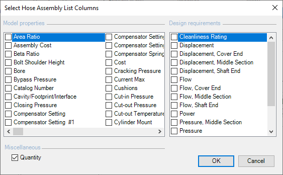 The Select Hose Assembly List columns checklist box displays.