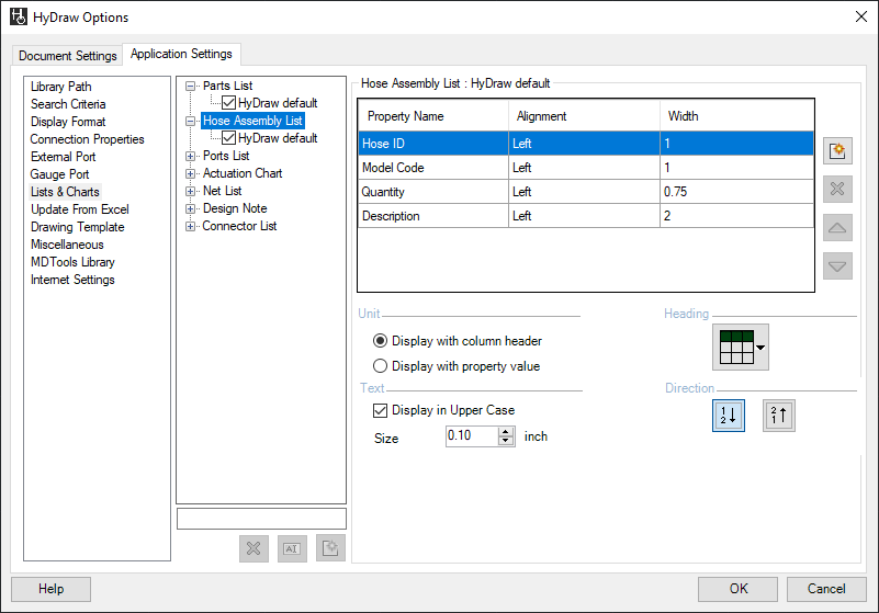 1. Click the Application Settings > Lists & Charts tab of HyDraw® Options and select Hose Assembly List.