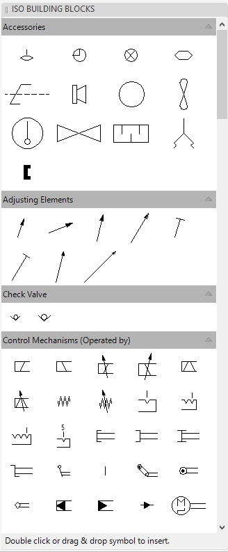 The ISO basic building block elements are structured in logical folders for easy access. This is a dock able window.
