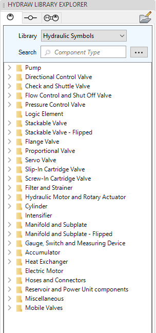 The Component library is a logically structured symbol library of hydraulic, pneumatic, and electrical systems.