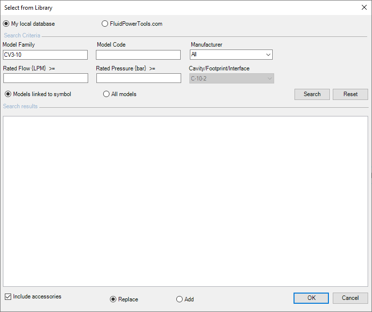 3. Select the database to search, i.e., My local database or FluidPowerTools.com.