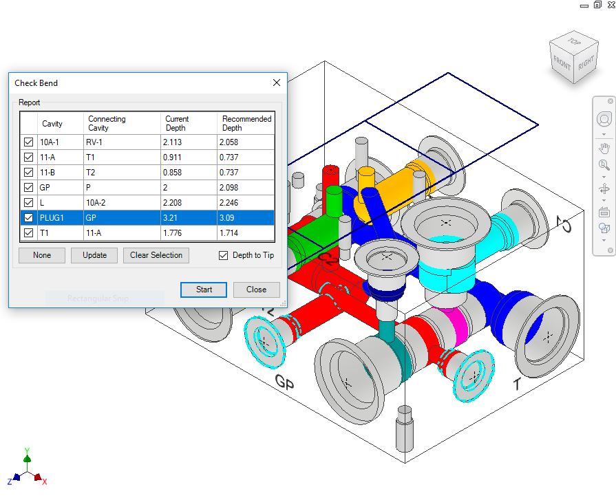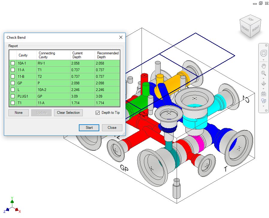 The Check Bend dialog box displays the cavity, connecting cavity, current depth, and recommended depth.
