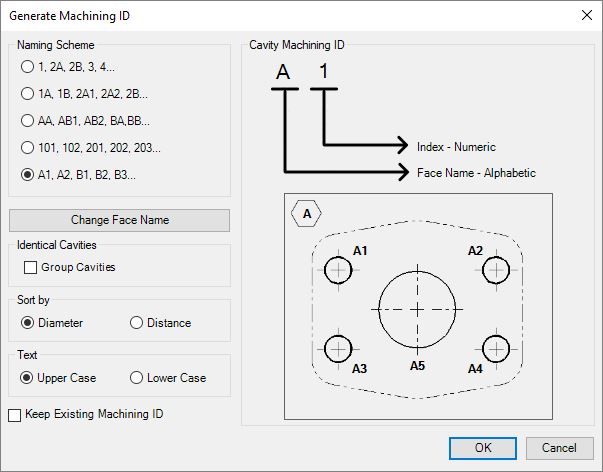 Automatically generate machining IDs for all the cavities on the manifold. It is based on the diameter or the distance naming options and one of the four alternative numbering options.