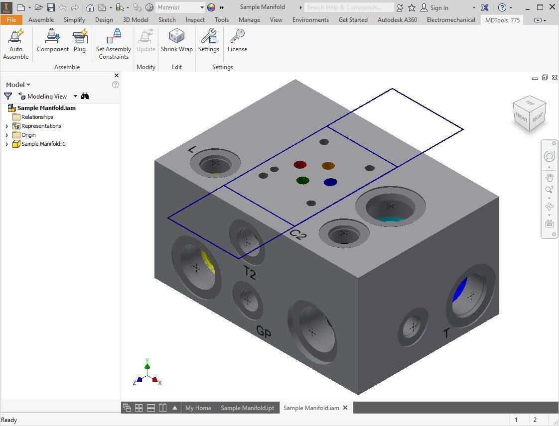 1. Create a new assembly drawing (.iam) and place the manifold into the assembly drawing using the Place Component command in Inventor.
