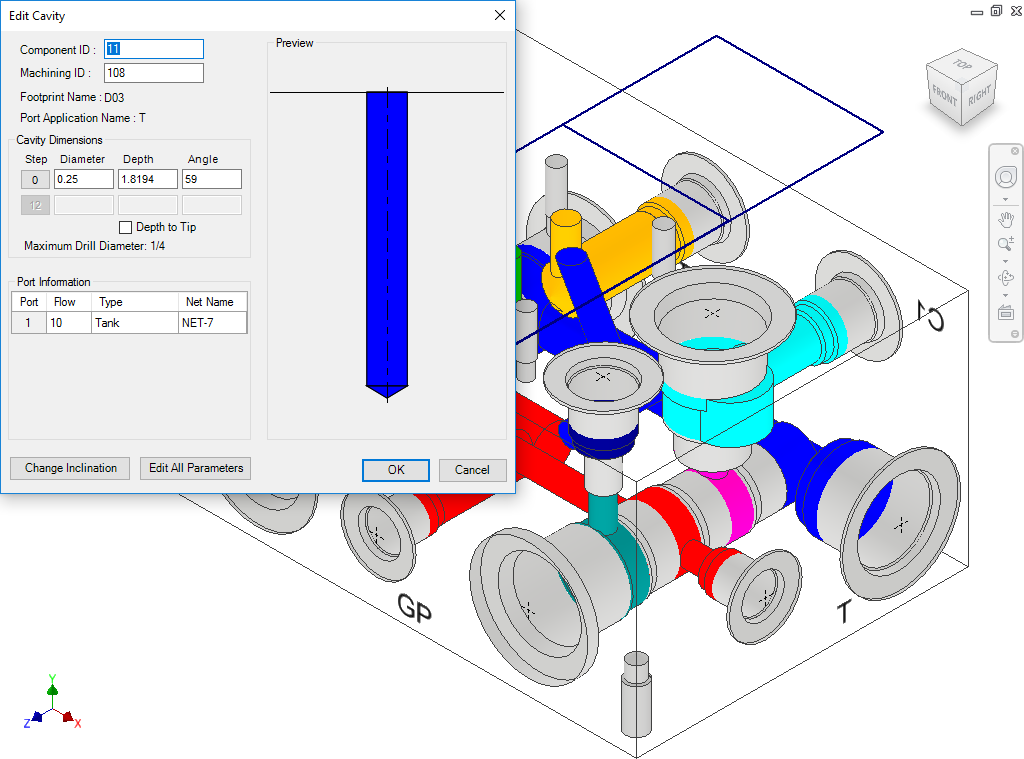 Change the design-specific cavity dimensions inside Inventor, if you select a cavity. It also enables you to select a tool (Drill or Spot Face) from a tooling knowledge base. This helps avoid the use of non-standard drills and spot faces.