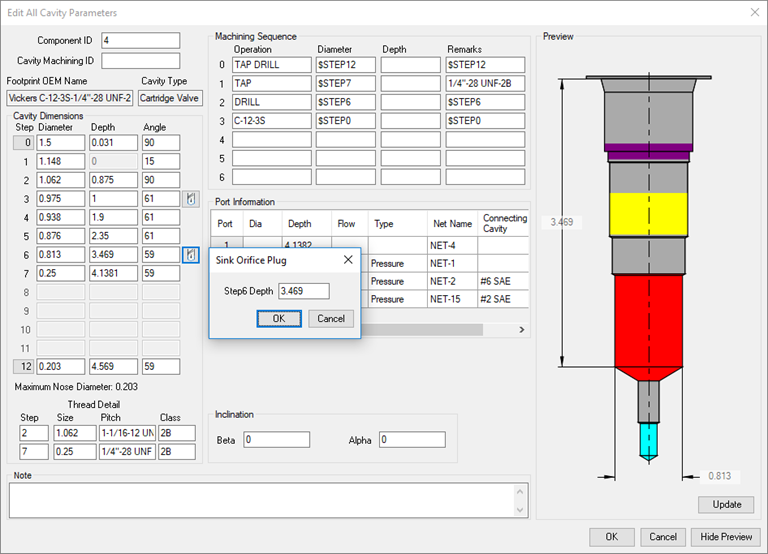 · The Stretch Cavity Step icon (Similar feature for cartridge valve insertion) will be available for 2 and 3 port cartridge valve cavity for steps in which the top port of the cavity ends.