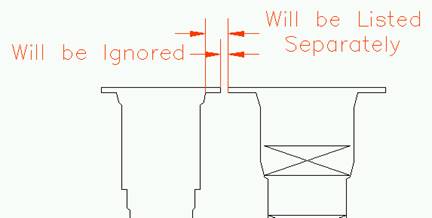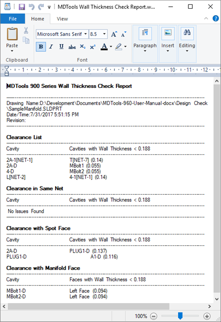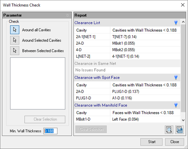If the wall thickness between the cavities is less than the minimum required value specified, then wall thickness check will list in parenthesis, the actual wall thickness between the cavities next to the cavity name.