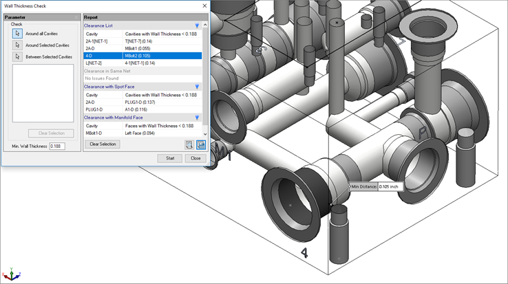 MDTools® checks the internal wall thickness between cavities and displays the list of cavities with wall thickness less than the specified value. All the cavities in the manifold are grayed out.