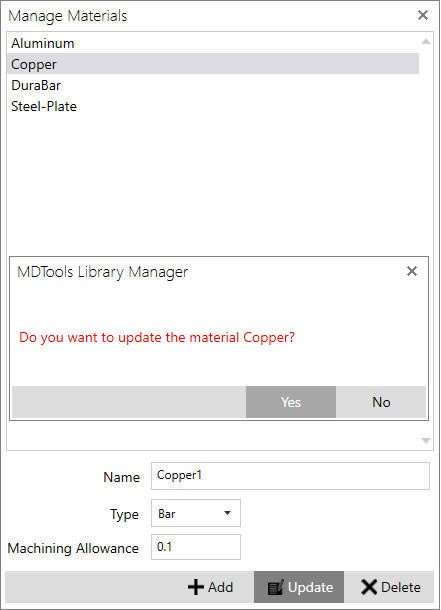5. Check the material name mentioned in the message box to make sure that the correct material is selected for updating.