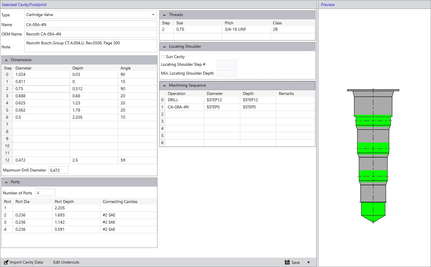 Stores the details of Mandatory and Optional Undercut for the Cartridge Valve cavity.