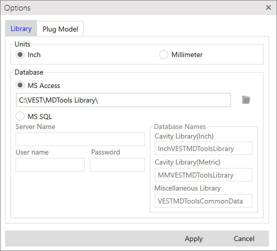 If Inch is selected, all MDTools® Library Manager commands use inch libraries. (i.e. InchVESTMDToolsLibrary.mdb is used for cavity command)