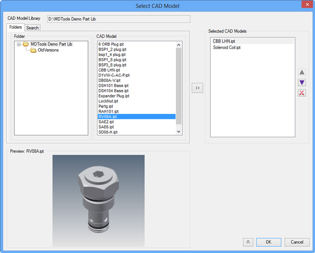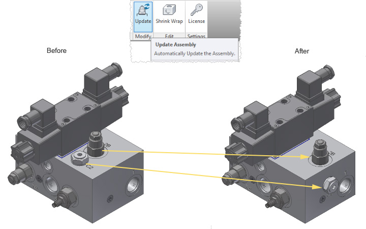 Assembled valve model moved to a new location automatically Valve model moved and assembled with cavity on a new face automatically |