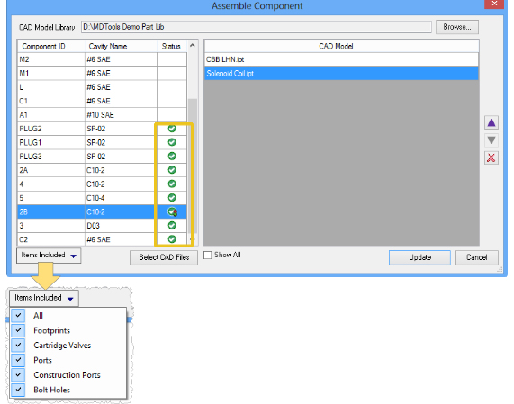 Status, shows assembled and unassembled cavities Update Icon indicates that an update is required