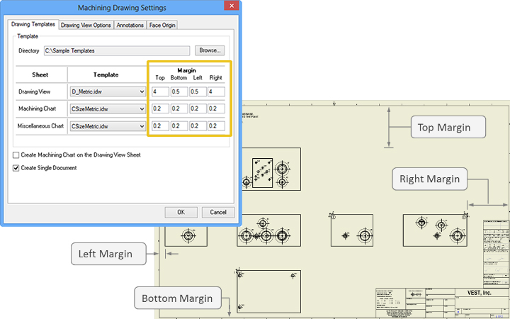 Specify the top, bottom, left, and right margin for each template to generate the machining drawing.