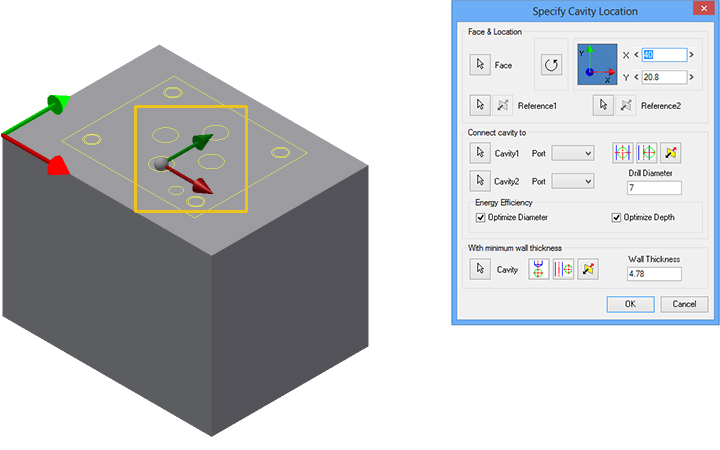 Position a cavity in the model by dragging the center point of the selected cavity Move and position a cavity along an ordinate by grabbing one of the directional arrows